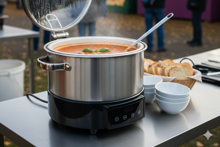 Dieser professionelle Suppenwärmer ist die ideale Lösung, um Ihre Suppen, Eintöpfe oder Glühwein über Stunden hinweg auf der perfekten Serviertemperatur zu halten. Das kompakte und benutzerfreundliche Gerät lässt sich mühelos transportieren und ist sofort einsatzbereit, um Ihre Gäste warm zu verwöhnen.